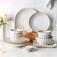 Waves of Beige Dining Set- Beige and white waved dinner plates and bowls.
